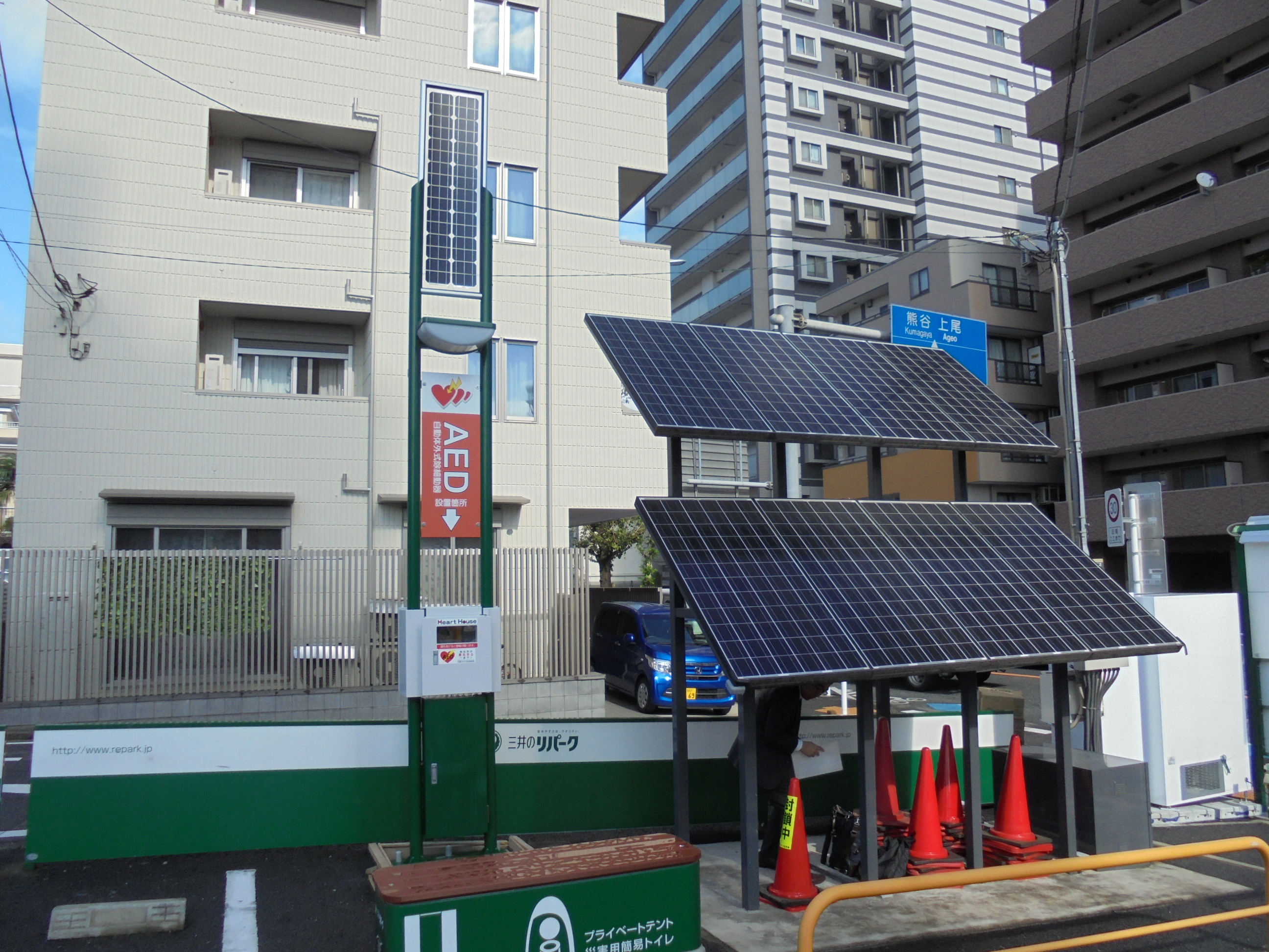 当社の「ソーラーLED街路灯エコアヴェニューAEDこみち」が、「三井のリパーク」埼玉県立近代美術館東駐車場に、災害時などに役立つ「災害支援型駐車場」として導入されました。