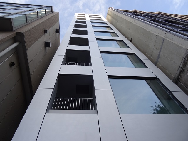 3㎜のアルミ板に「ハードPHL+アルマイト+艶消し電着クリアー」を施した外装カットパネルは、二次電解着色のみのマットな均一感と違い、ハードPHLの研磨目があることで落ち着きのあるシックさを演出し、そこに陽があたると、ステンレスとは違った淡い煌めきを演出しています。詳しくは、下記URLよりご参照ください。